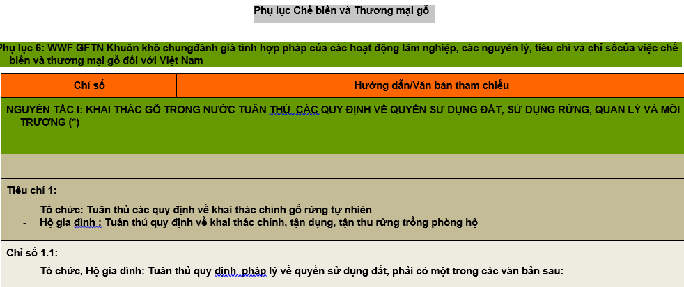 Mạng lưới Kinh doanh lâm sản Toàn cầu của Quỹ Quốc tế về Bảo tồn thiên nhiên (WWF). Khuôn khổ chung đánh giá tính hợp pháp các hoạt động Lâm nghiệp. Phụ lục Chế biến và Thương mại gỗ Xem chi tiết phụ lục: Tải xuống Vietnam Legality Framework updated Feb 17 VIE
